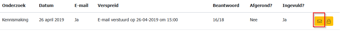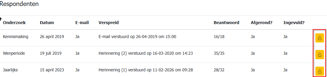 Hier kan je de onderzoeken weer openen en opnieuw verzenden door te klikken op het slotje achter het onderzoek. (klik je nogmaals op het slotje, dan wordt het onderzoek weer afgerond/gesloten)