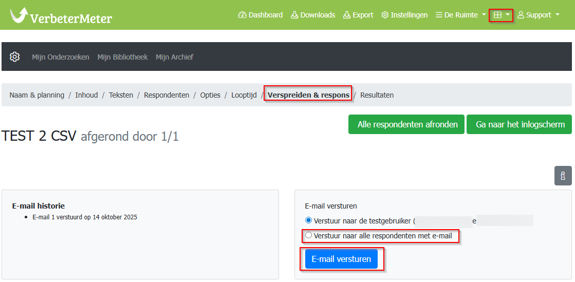 Het versturen van een herinnering is een handmatige actie. Via het tabblad Verspreiden & respons kan er een herinnering verstuurd worden. Vink het bolletje aan bij Verstuur naar alle respondenten met e-mail. Alleen de respondenten die de vragenlijst nog niet ingevuld of afgerond hebben ontvangen dan deze herinneringsmail.