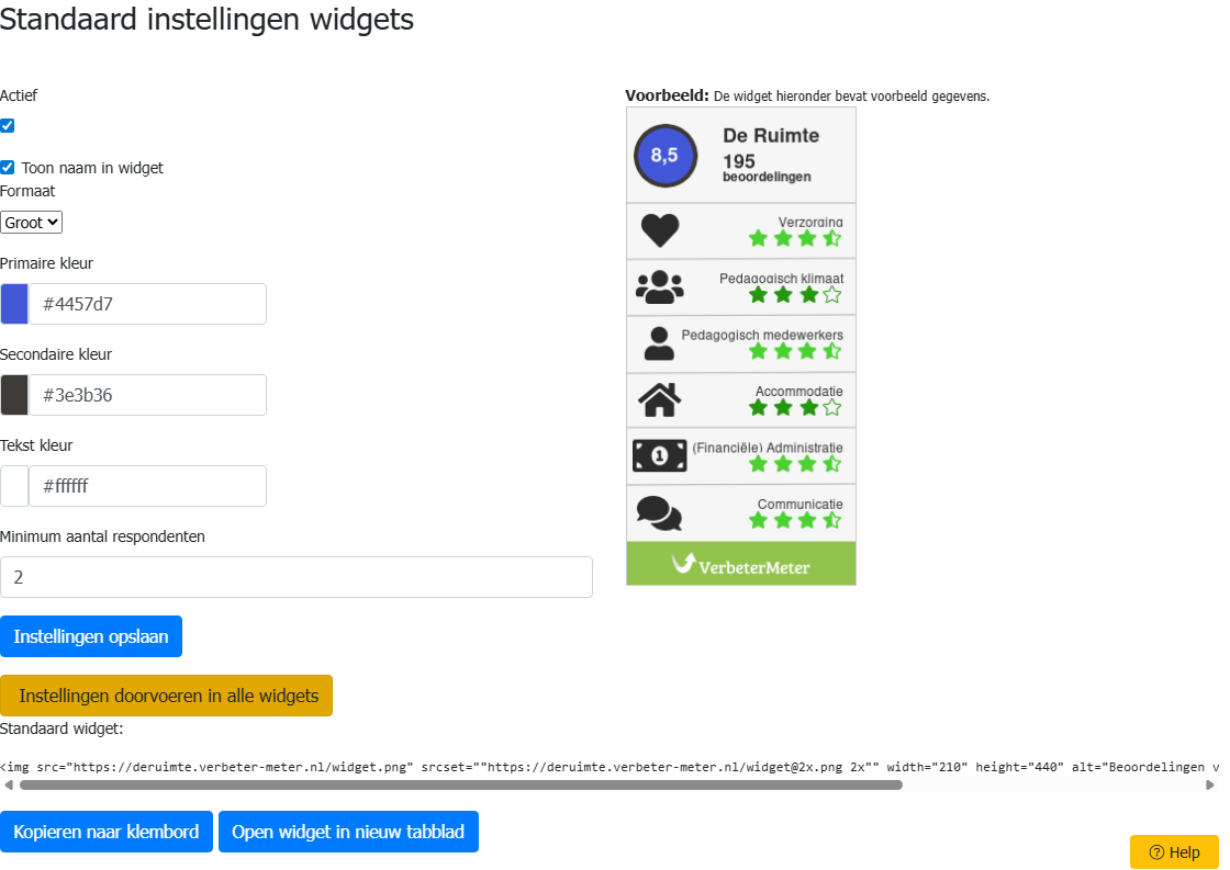 Stap 8a: Voor het publiceren van de widget kopieert u de tekst die ingevuld is in het veld van de standaard widget of klik op de blauwe button ‘Kopiëren naar klembord’.