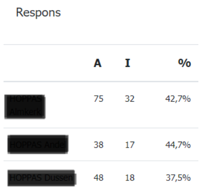De kolom Respons toont het aantal verstuurde (A) en ingevulde onderzoeken (I) + de responspercentage (%)