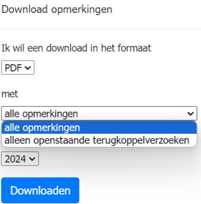 Via de oranje button Download opmerkingen kun je 2 rapportages maken: