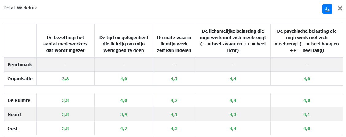 Op het tabblad Detail worden de resultaten op vraagniveau getoond. Klik op één van de onderdelen om de onderliggende vragen te kunnen zien. Er worden 3 verschillende scores getoond: