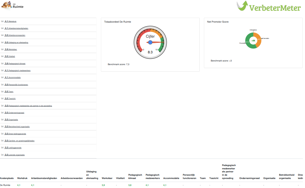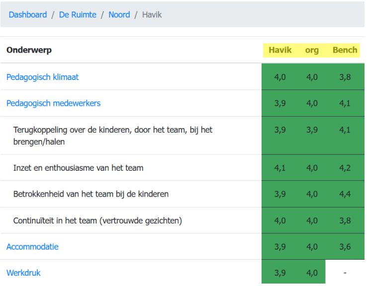 Links bovenaan de pagina tref je alle gemiddelde scores aan, zoals deze gescoord zijn op de vragen. Naast de locatiescore zie je de organisatiescore (org) en de benchmark (Bench).