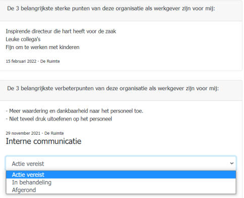 Links onderaan de pagina worden de antwoorden op de 2 open vragen weergegeven. Bij het beantwoorden van deze open vragen kan de medewerker uit de anonimiteit treden door naam, e-mailadres of telefoonnummer achter te laten indien hij/zij een reactie van de organisatie wil ontvangen. De verantwoordelijk medewerker namens de organisatie kan een opmerking invullen in het veld onder Interne communicatie en vervolgens kiezen uit de opties: