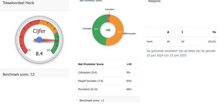 Rechtsboven aan de pagina wordt het totaalooordeel van de kostenplaats getoond. Daaronder de NPS score en daaronder weer de kolom Respons. In de kolom Respons wordt vermeld hoeveel onderzoeken er in totaal verstuurd zijn (A) en hoeveel er daadwerkelijk ingevuld zijn (I) + de responspercentage. Resultaten op het dashboard zijn altijd de resultaten van vandaag tot 1 jaar terug.
