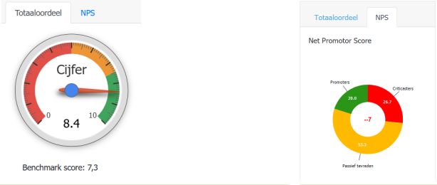 Rechts op de pagina wordt ook nog het totaalcijfer van de regio/cluster, de NPS score en een overzicht van de respons getoond