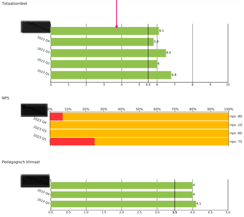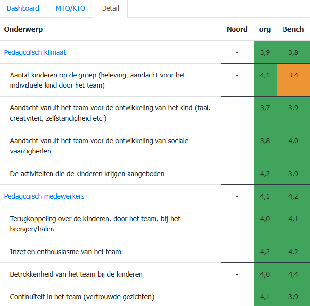 • De weergavebalkjes veranderen van kleur op basis van behaalde resultaten. Een indicator onder de 3,5 kleurt rood. Alles boven de 3,5 kleurt groen.
