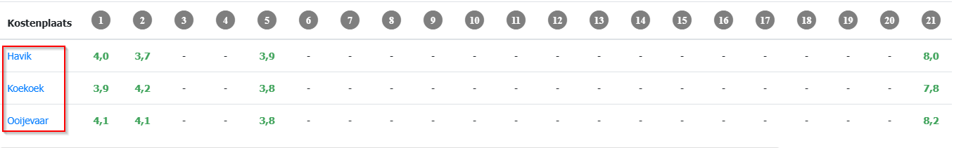• De eerste resultaten die je ziet zijn de gemiddelde cijfers van de kostenplaatsen. De cijfers tonen een gemiddelde scores op basis van de gescoorde resultaten van de respondenten en zijn gebaseerd op een 5- puntschaal. De minimale score is een 1 en de maximale score een 5.