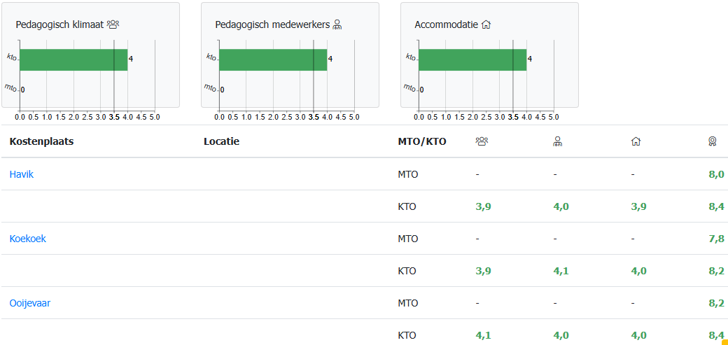 Hier worden de resultaten vanuit het klanttevredenheidsonderzoek (KTO) en het medewerkerstevredenheidsonderzoek (MTO) getoond per kostenplaats over de onderwerpen Pedagogisch Medewerkers, Pedagogisch Klimaat en Accommodatie.