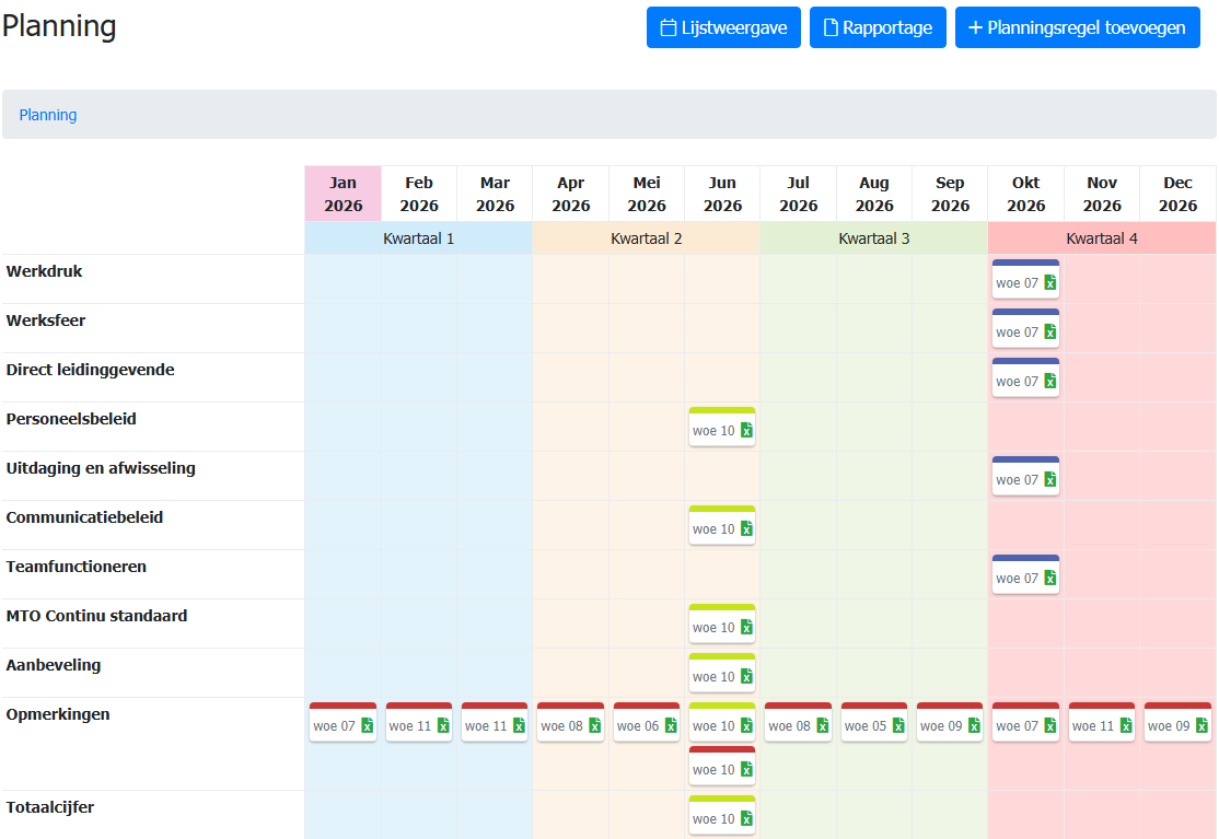 Actueel geeft een rapportage op basis van de periode vandaag t/m 1 jaar terug. Het standaard rapport kan direct gedownload worden als PDF. Maak het rapport specifieker door te kiezen voor kwartalen, rapport opbouw, onderwerpen en kostenplaatsen.