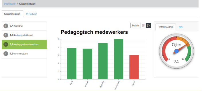 Hier wordt het totaaloordeel van de kostenplaatsen getoond. Het totaaloordeel is een gemiddeld rapportcijfer tussen 1 en 10 en is gebaseerd op de score die de respondenten geven op de rapportcijfer vraag “Wat is het totaalcijfer voor onze opvangorganisatie?”