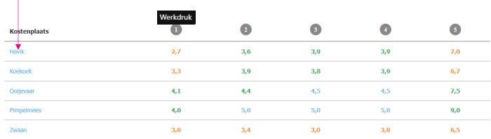 Klik op een kostenplaats om de resultaten van een kostenplaats te kunnen zien. Om door te kunnen klikken op een kostenplaats moeten er minimaal 3 respondenten per kostenplaats zijn waarvan er ook 3 de vragenlijsten ingevuld en afgerond moeten hebben.
