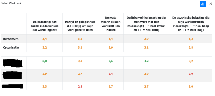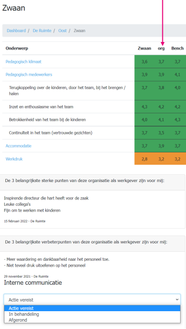 Links bovenaan de pagina tref je alle gemiddelde scores aan, zoals deze gescoord zijn op de vragen. Naast de locatiescore zie je de organisatiescore en de benchmark.